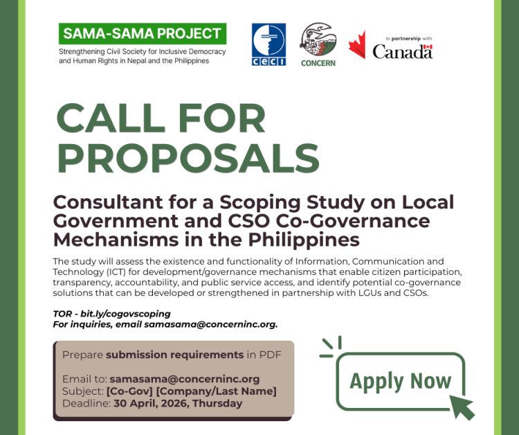 To support this objective, the project will commission a Scoping Study on Local Government and CSO Co-Governance Mechanisms. The study will assess the existence and functionality of Information, Communication and Technology (ICT) for development/governance mechanisms that enable citizen participation, transparency, accountability, and public service access, and identify potential co-governance solutions that can be developed or strengthened in partnership with LGUs and CSOs.